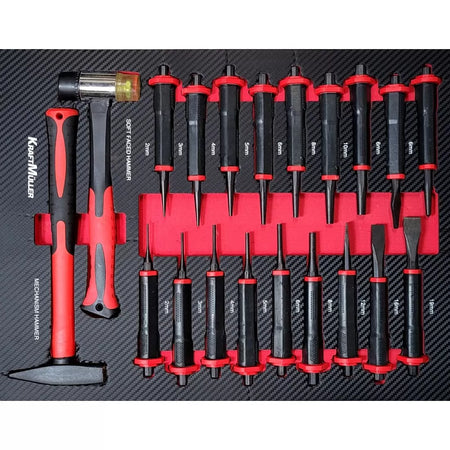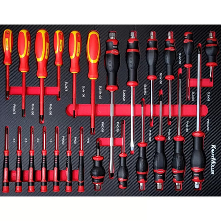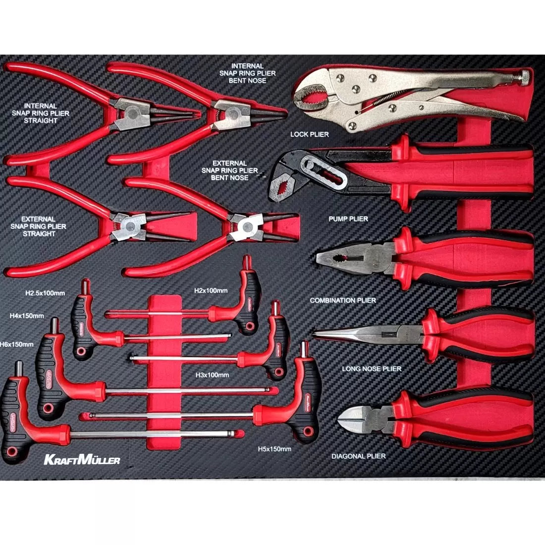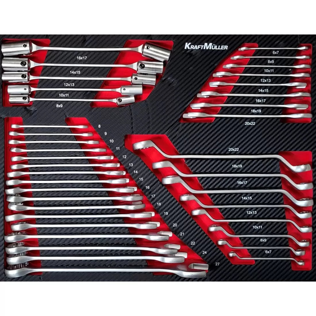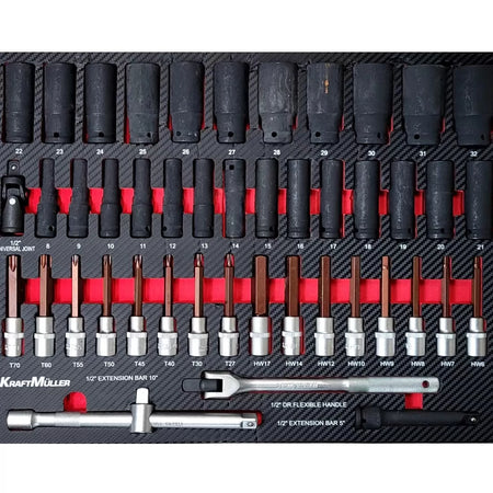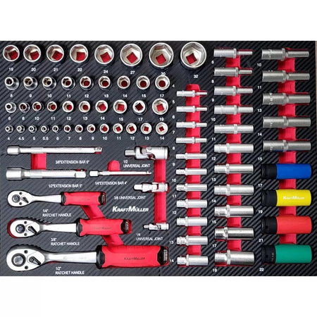 Este carro de taller consta de siete cajones con herramientas profesionales de la reconocida marca alemana Kraft Müller, organizadas por tipo y tamaño en compartimentos de espuma EVA.