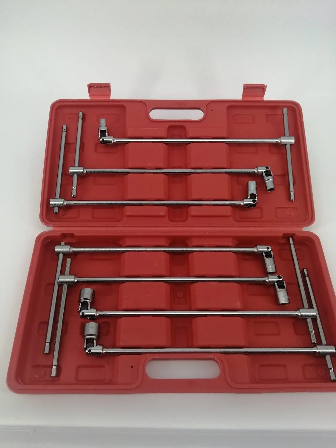 Este juego incluye siete vasos de diferentes tamaños (8 mm, 10 mm, 12 mm, 13 mm, 14 mm, 17 mm y 19 mm) compatibles con todos los tamaños habituales de bujías de encendido y de incandescencia. Cada vaso mide 395 mm de largo, lo que proporciona una longitud ideal para trabajar en espacios reducidos. Tanto si eres mecánico profesional como aficionado al bricolaje, estos vasos articulados con mango en T te permitirán realizar tus reparaciones con rapidez y precisión.