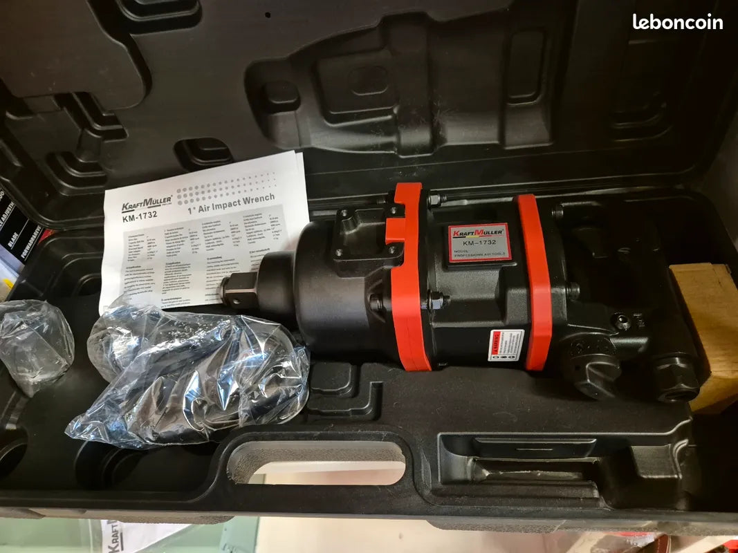 llaves de impacto neumáticas KraftMuller Pro Line de 1" para trabajos pesados con un par de 5000 Nm o 2800 Nm. Modelo 1 (cuadrado corto) - peso 13 kg - 4000 rpm - par de rotura máximo 2800 Nm: Esta llave de impacto neumática profesional de alto rendimiento es ideal para trabajos mecánicos, resolución de problemas y mantenimiento de maquinaria pesada, equipos de construcción o agrícolas, camiones, semirremolques, autobuses, embarcaciones, etc. Equipada con un mecanismo de impacto neumático, un embrague avanzado sin pasadores y carcasas de alta resistencia que proporcionan un par alto y estable bajo carga con una excelente durabilidad para soportar un uso intensivo. Incluye un selector de potencia de 3 niveles para apretar y aflojar, un sistema de absorción de vibraciones para mayor comodidad del usuario y una empuñadura lateral en D para un agarre seguro. 1 pulgada Husillo cuadrado para vasos de gran diámetro. Consumo de aire: 250 l/min. Presión de trabajo: 8 bar. Conexión neumática de 1/2". Incluye botella de lubricante, racor y dos vasos de impacto de 1" (32 y 33 mm). En su estuche de transporte. Nuevo.